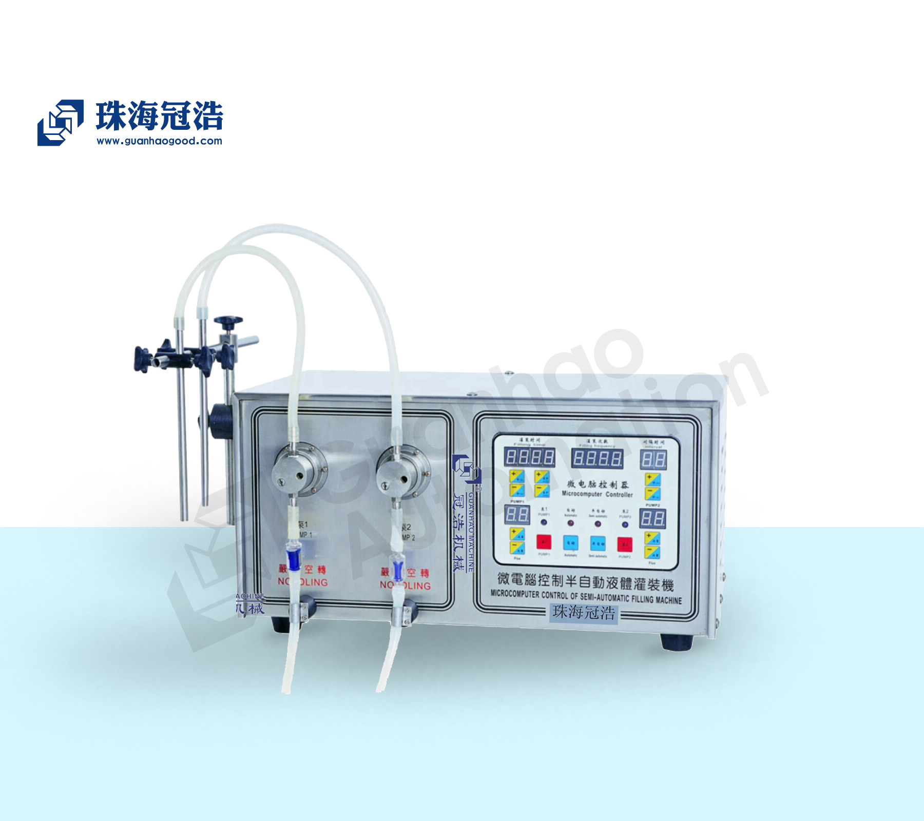 7、可配多個(gè)灌裝頭,常用的型號(hào)有:?jiǎn)伪脵C(jī)、雙泵機(jī)和四泵機(jī);