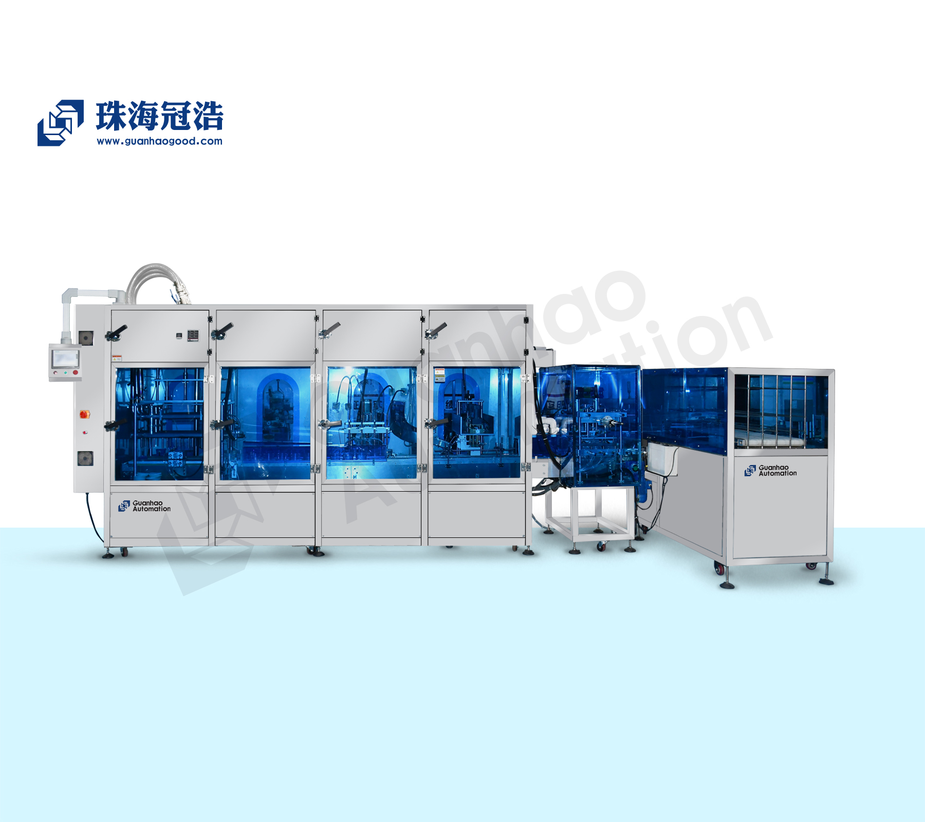 送瓶 → 氣動(dòng)取瓶插模 → 消毒 → 定量灌裝 → 送蓋→ 氣動(dòng)取蓋 → 旋蓋 → 脫模(模具循環(huán))→ 出瓶